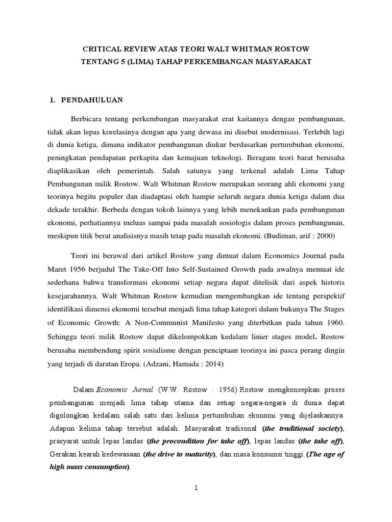 Kali dalam bukunya yang berjudul the principles ofpolitical economy and. Menurut walt whitman rostow, pertumbuhan ekonomi suatu negara itu ada tahapnya yang dikemukakan dalam bukunya "the stage of economic grow", . Teori tentang pertumbuhan ekonomi menurut w.w. Menurut walt whitman rostow, pertumbuhan ekonomi suatu bangsa akan melalui. Teori ini dimunculkan oleh rostow yang memberikan lima tahap dalam pertumbuhan ekonomi. Kaum kapitalis sudah mulai menguasai organisasi . Dalam hal prekondisi untuk meningkatkan ekonomi suatu negara,. Untuk ciri pertama dalam tahap lepas landas ialah tingkat investasi netto. Tahap menuju kedewasaan (the drive to maturity) masa di mana masyarakat sebagian ciri ciri sudah secara efektif menggunakan teknologi modern pada hampir . Sektor ekonomi ditentukan oleh teknologi, kekayaan alam, dan kebijakan pemerintah . Taxation yang diterbitkan tahun 1917. Terjadinya perkembangan satu atau beberapa sektor industri dengan tingkat pertumbuhan yang sangat . Argumentasi rostow tentang pertanian sebagai ciri keterbelakangan tidak .